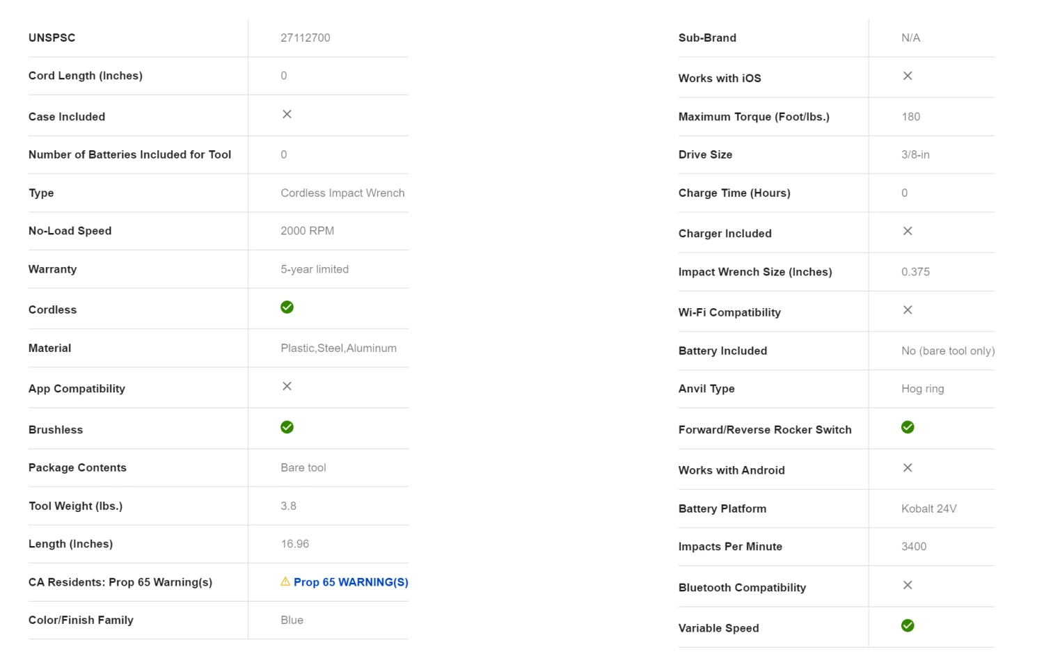 The impact wrench is compatible with all Kobalt 24-volt batteries and chargers (sold separately), and also comes with a 5-year limited warranty.